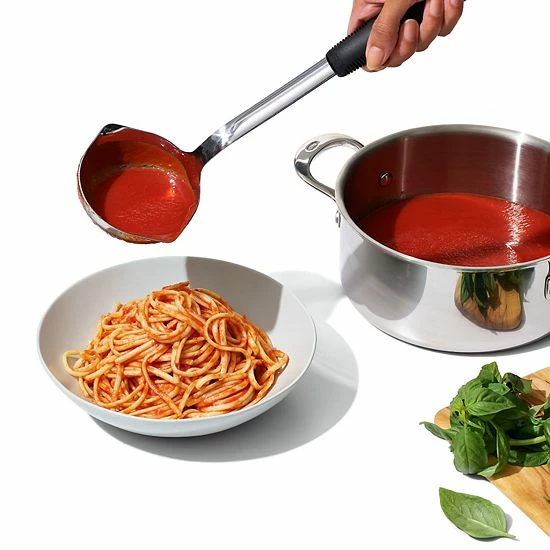 Skip the messy side of scooping and pouring hearty sauces with OXO Good Grips Stainless Steel Ladle. Serve soups, stews and more without worrying about run-off or drips ruining your tablecloth.