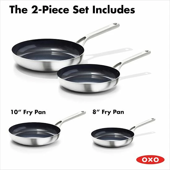 A must-have for any kitchen, this OXO Mira 3-Ply stainless steel frying pan set features a powerful ceramic non-stick coating infused with diamonds to deliver remarkable non-stick ease.