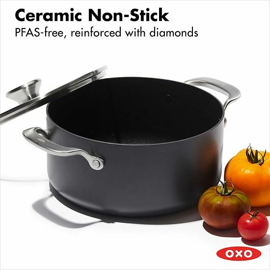 Featuring a heavy-duty induction base that works on every stovetop, This OXO Professional Ceramic Non-Stick stock pot was designed with a diamond-reinforced ceramic non-stick coating that delivers effortless food release with less oil.
